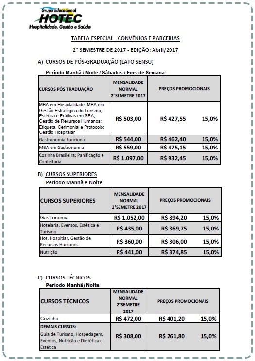 Hotec divulga tabela de descontos para entidades parceiras