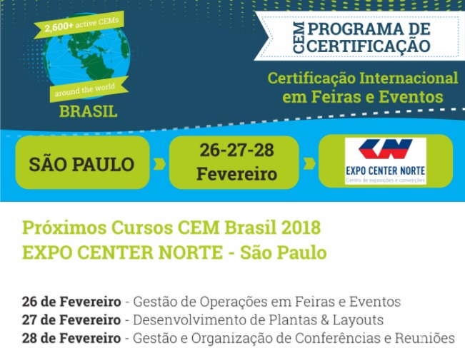 Os cursos acontecem nos dias 26, 27 e 28 de Fevereiro no Expo Center Norte, em São Paulo. CEM é a certificação por excelência para este setor. Atualmente, mais de 2.600 profissionais em todo o mundo têm a almejada certificação CEM e pertencem a este grupo restrito de excelência global.