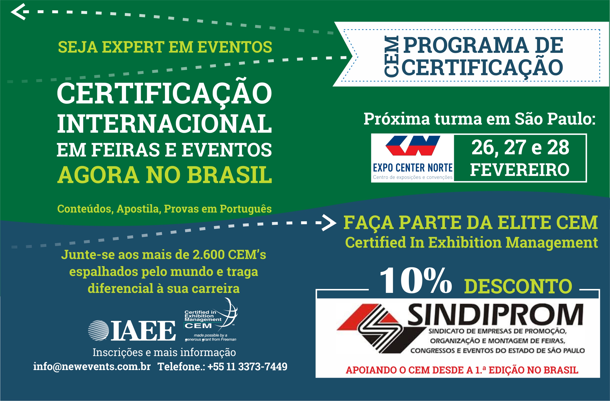 Os cursos acontecem nos dias 26, 27 e 28 de Fevereiro no Expo Center Norte, em São Paulo. CEM é a certificação por excelência para este setor. Atualmente, mais de 2.600 profissionais em todo o mundo têm a almejada certificação CEM e pertencem a este grupo restrito de excelência global.