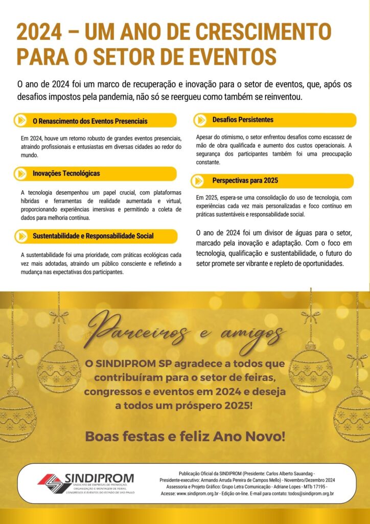 Está no ar a edição bimestral – novembro/dezembro de 2024 do Sindiprom News. Uma publicação colaborativa entre Sindiprom SP e Abrace para trazer todos os meses, informações relevantes ao segmento de eventos. Boa leitura!