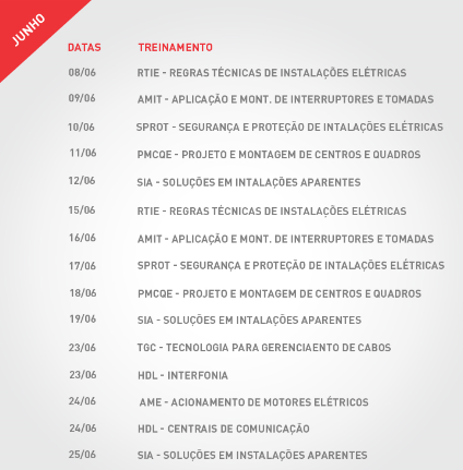 O Grupo Legrand oferece toda a solução de segurança e proteção em instalações elétricas. Para saber a grade completa dos cursos de junho, acesse o site Clube Contato, pelo 0800 11 8008 ou pelo email br-spl-clube-contato@legrand.com.br as inscrições são gratuitas.
