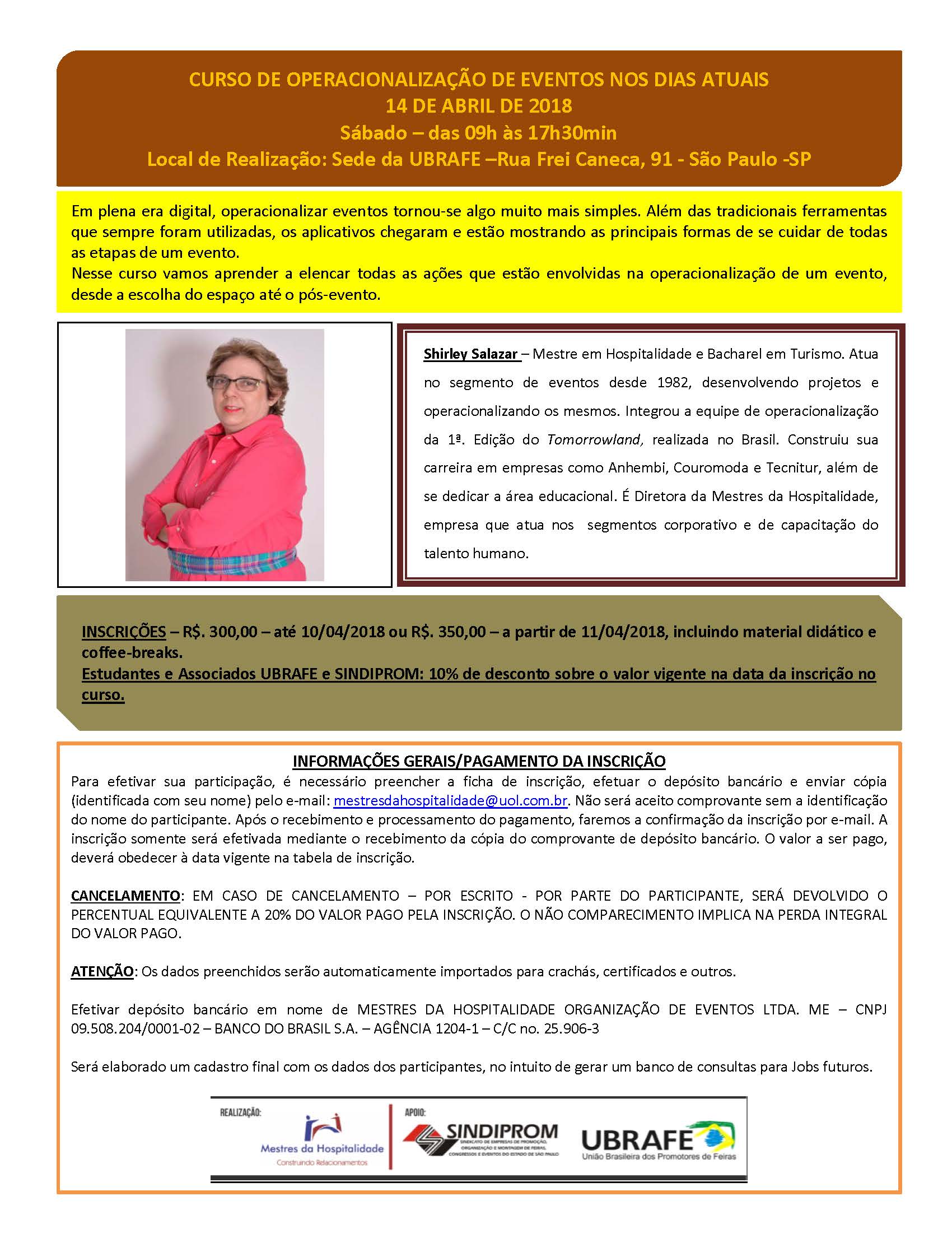 O curso rápido de “Operacionalização de Eventos nos dias atuais” será realizado na sede da UBRAFE – União Brasileira dos Promotores de Feiras, no próximo dia 14 de abril de 2018, das 09h às 17h30min, ministrado por Shirley Salazar, Mestre em Hospitalidade e Bacharel em Turismo. Atua no segmento de eventos desde 1982, desenvolvendo projetos e operacionalizando os mesmos. Integrou a equipe de operacionalização da 1ª. Edição do Tomorrowland, realizada no Brasil. Construiu sua carreira em empresas como Anhembi, Couromoda e Tecnitur, além de se dedicar a área educacional.