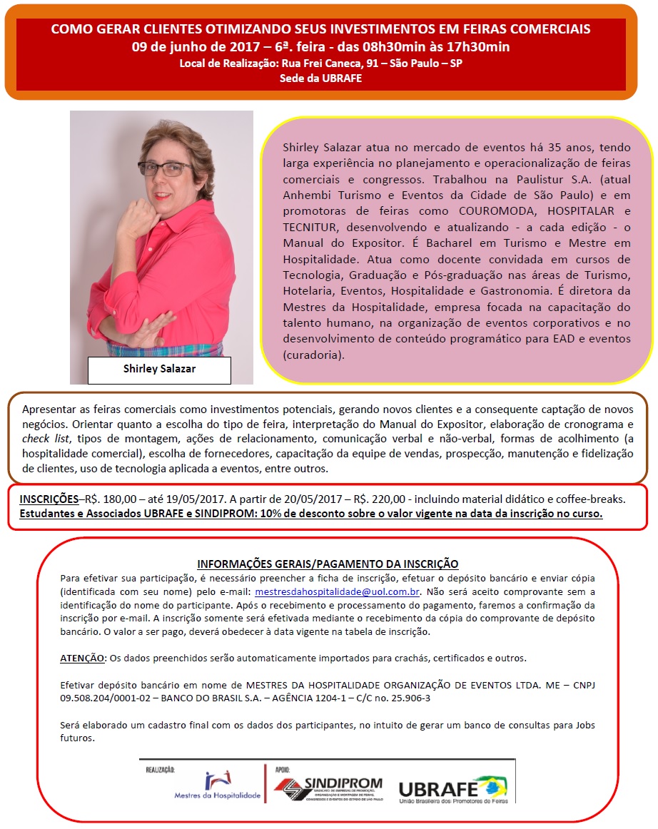 O curso rápido sobre Feiras Comerciais será realizado na sede da UBRAFE – União Brasileira dos Promotores de Feiras, no próximo dia 9 de junho de 2017, das 08h30 às 17h30min, ministrado por Shirley Salazar, apresentando conteúdo inovador, as novas tendências, o que contemplar ao escolher participar de uma feira comercial, quais as ações que podem ser desenvolvidas, o manual do expositor – como interpretá-lo, como prospectar, comercializar ou manter clientes, a hospitalidade comercial como agente condutor de negócios.