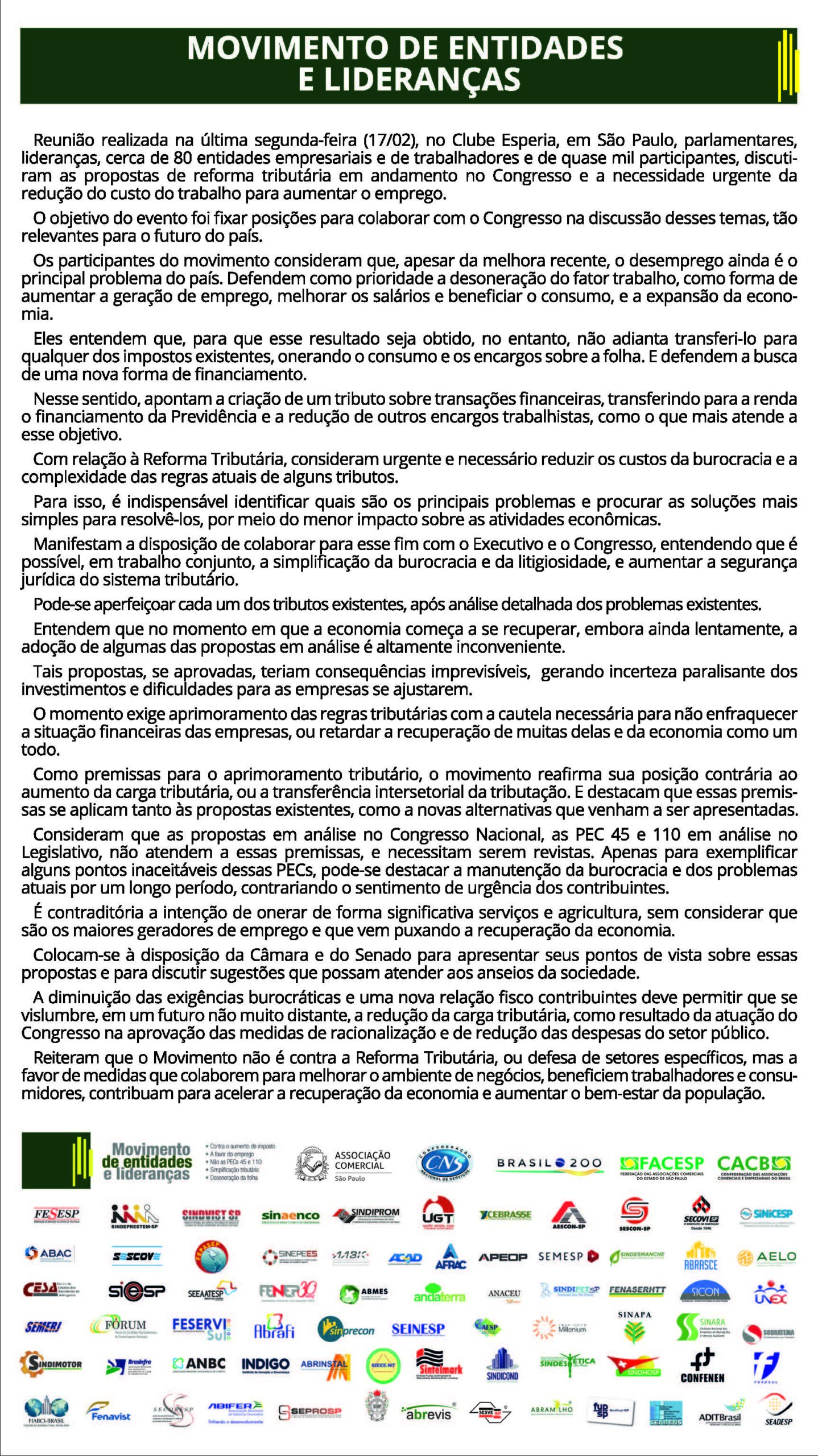 Anexamos, para seu conhecimento e divulgação, o anúncio do manifesto que está sendo veiculado (hoje 21/02/20) no jornal Valor Econômico.