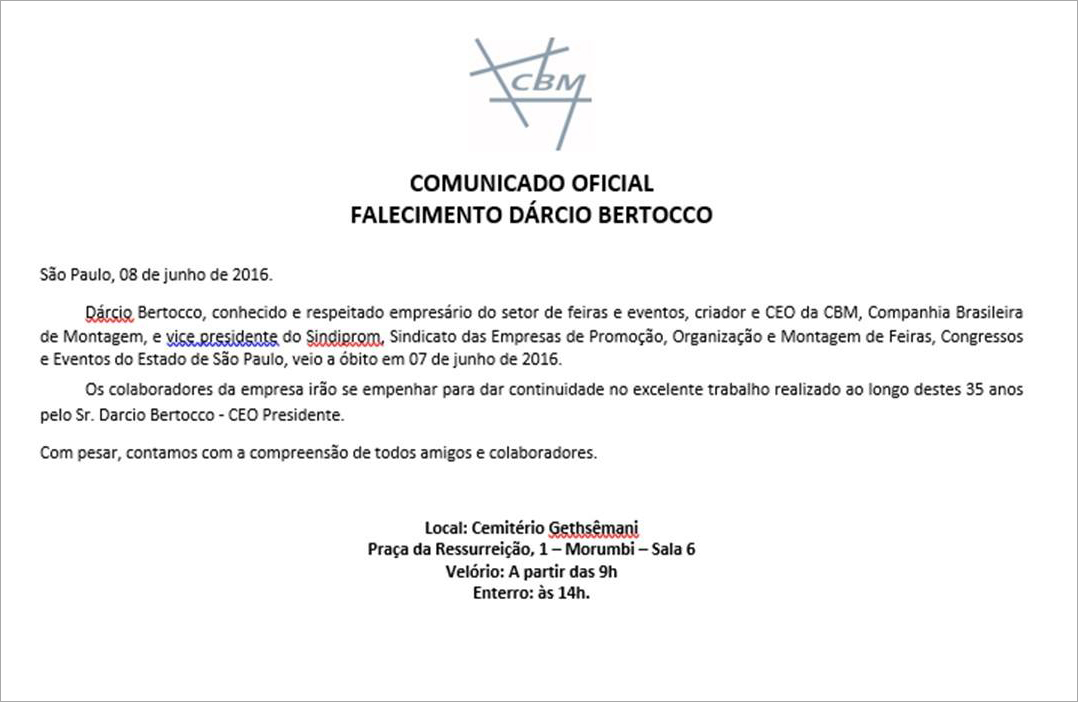Faleceu nesta data (07/06) nosso Vice Presidente (UBRAFE e SINDIPROM-SP) Dárcio Bertocco.