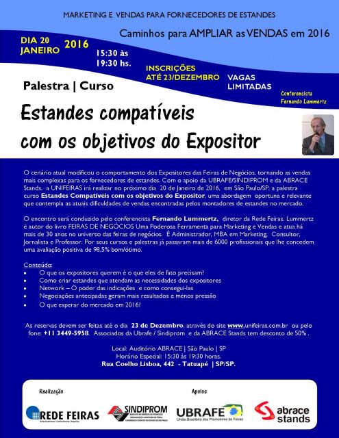 Com apoio do Abrace Stands, Sindiprom e Ubrafe, Fernando Lummertz, consultor especializado em feiras de negócios, vai apresentar a palestra “Estandes Compatíveis com os Objetivos do Expositor” que orienta os empresários do segmento de montagem e cenografia de estandes para atender as reais necessidades dos expositores das feiras de negócios. O evento acontece no dia 20 de janeiro de 2016, na sede da Abrace Stands, em São Paulo,
