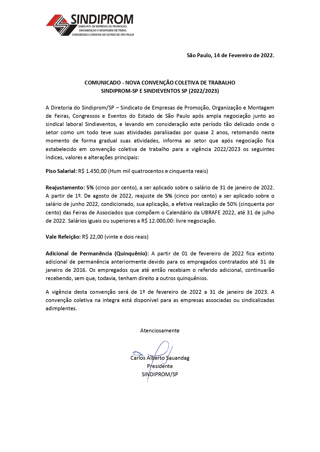 A Diretoria do Sindiprom/SP – Sindicato de Empresas de Promoção, Organização e Montagem de Feiras, Congressos e Eventos do Estado de São Paulo após ampla negociação junto ao sindical laboral Sindieventos, e levando em consideração este período tão delicado onde o setor como um todo teve suas atividades paralisadas por quase 2 anos, retomando neste momento de forma gradual suas atividades, informa ao setor que após negociação fica estabelecido em convenção coletiva de trabalho para a vigência 2022/2023 os seguintes índices, valores e alterações principais: